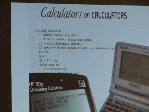 1. Richard Nelson and group Opening Remarks and Attendee Introductions 2. Tim Wessman (HP) HP Calculators Outside -> Inside 3. Ted Kerber Simplifying Communication - HP50g to Surveying Instruments 4. Namir Shammas RPN2 5. Tim Wessman (HP) How HP Builds Calculators 6. Richard Nelson Remembering the HP41 / HP-IL System - the Untold Story 7. Tim, Cyrille and Dirk Dykson (all HP) HP Q and A 8. Hugh Steers Calculators on Calculators 9. Richard Schwartz On Annealing 10. Cyrille and Tim Introducing the HP30b 11. Joseph K. Horn x<>y and Harley/Coke/Mustang Calculators + HP Calculator Bug Hunting 12. Richard Ottosen "DIY RPN" Calculator Hardware 13. Wlodek Mier-Jedrzejowicz Should Einstein Have Used One? 14. Geoff Quickfall HP41C Calculator and Card Reader Restoration 15. Cyrille de Brebisson (HP) "142164808C" - HP50g System RPL Devlopment 16. Gene Wright Programming on the HP30b 17. Gene Wright The New Product Generation Process (Griffin Technology - iPhone/iPod products) 18. Brian Maguire Fundamentals of a Computer Algebra System (CAS) 19. Andreas Moller An Improved HP50g Stopwatch Application & An Enhanced Solver Application 20. Egan Ford HP-IL 2009 21. Jake Schwartz E-Ink, Haptic Touch and MEMS 22. Richard Schwartz The KY-0 Starbucks Crypto System The full (roughly 16-hour) conference, recorded on 6 DVDs, is available for $20.00 or on a singleFormat DVD for $10.00 (including shipping anywhere).