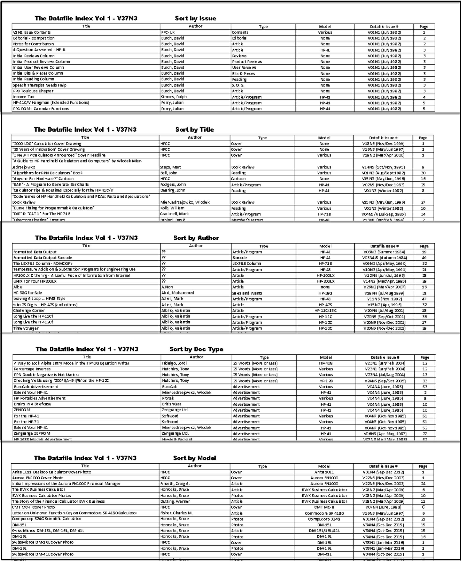 o Also including the HPCC Datafile Index for Volumes 1-37: An index of 4,853 entries indexed five ways (by issue, item title, author, document type and calculator model)