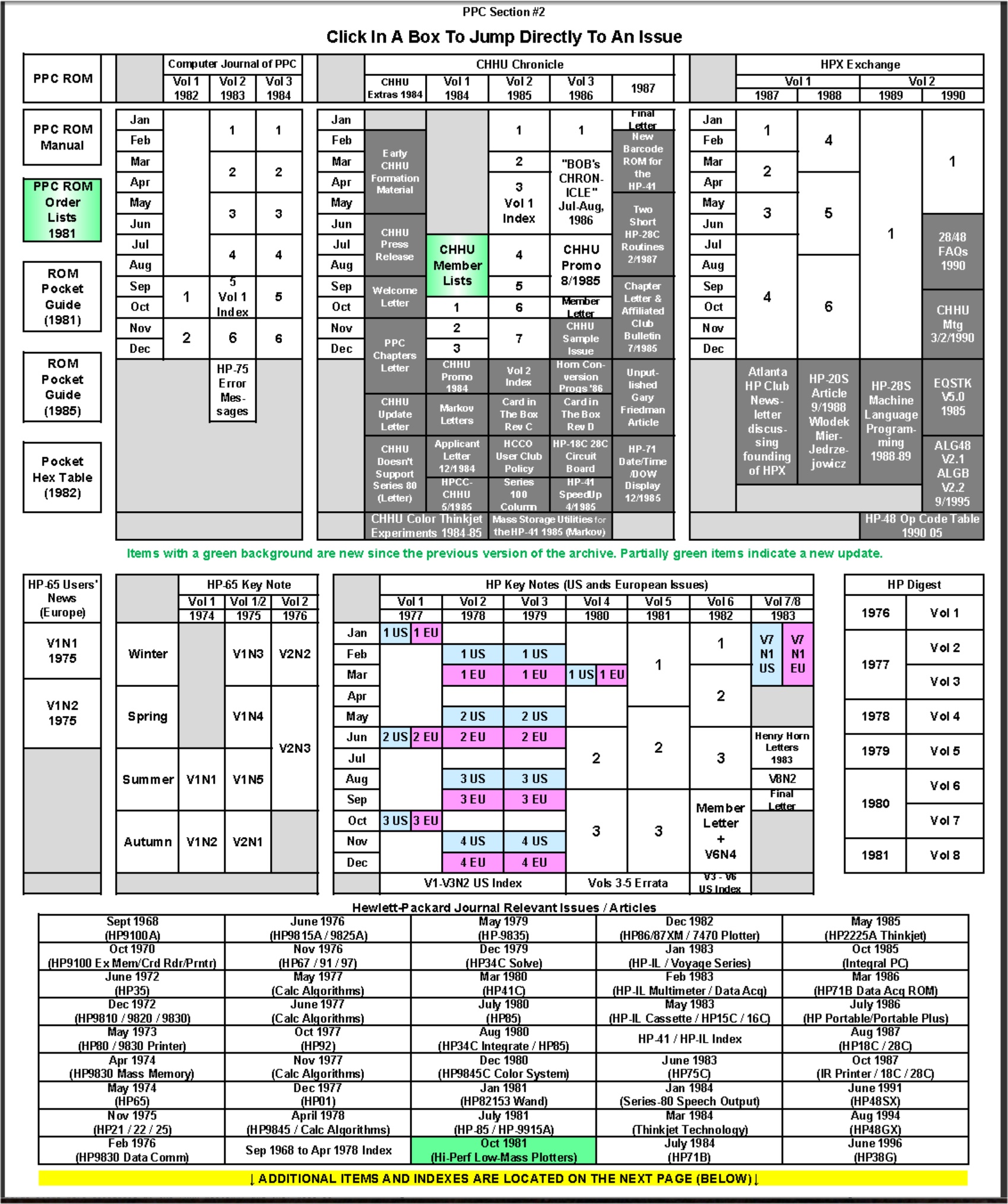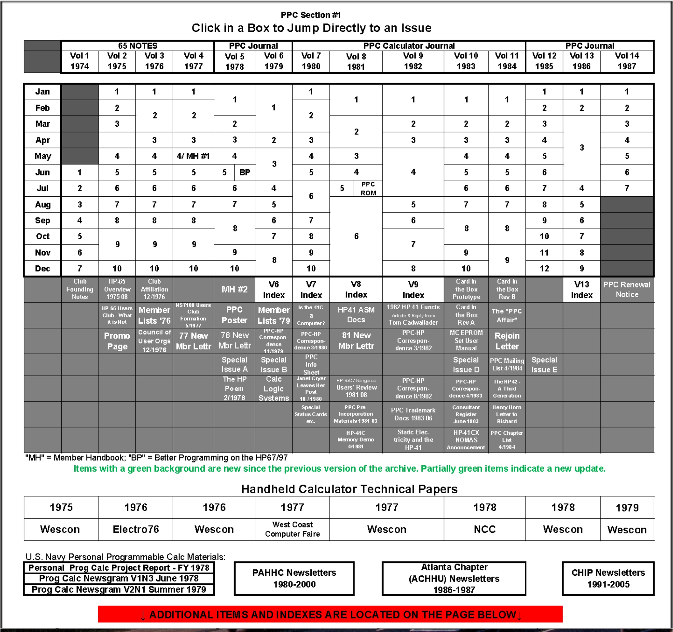 The Section 1 portion consisting of 65 NOTES/PPC Calculator Journals Volume 1 through Volume 14 (the end) plus all the Chicago-area CHIP group newsletters 1991 to end of publication in 2005 and the Philadelphia-area PAHHC handout matrials from Jan 1980 to Sept 2000 (16,249 pages) Now also includes 5,854 pages from Jackie Woldering's 1,354 program/barcode files